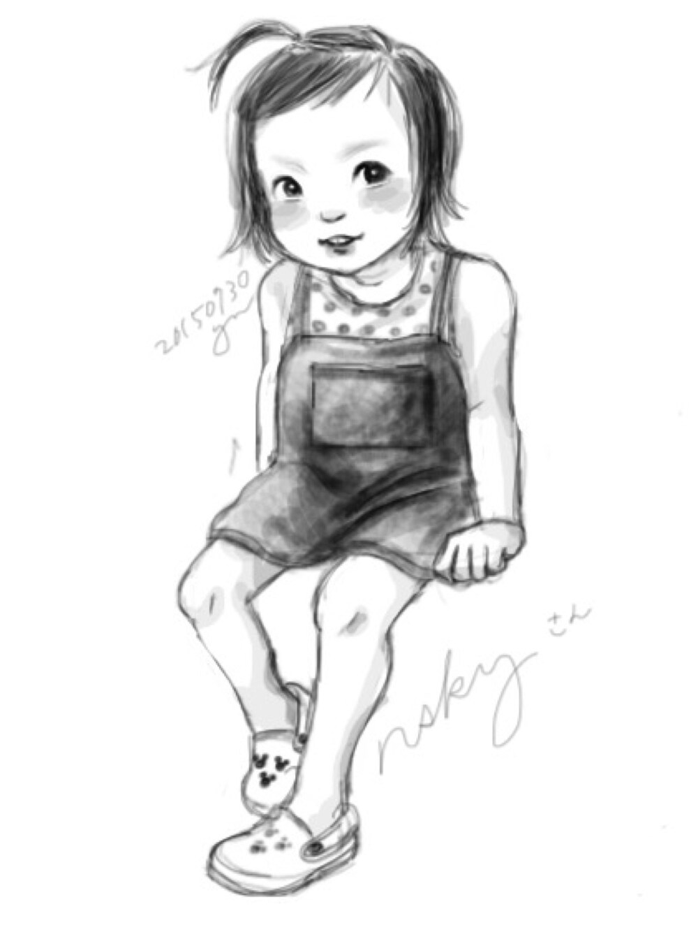nsky様のムスメさんです。 デニムのこのコーデがすごく可愛かったので描かせていただきました(^_^) 夏に着るデニムって、重いようで意外とさわやかに着れると思うので私は大好きです。 デニムのサロペットやワンピースなら親子でもリンクコーデできそうですね(^^)❤️ ありがとうございました!