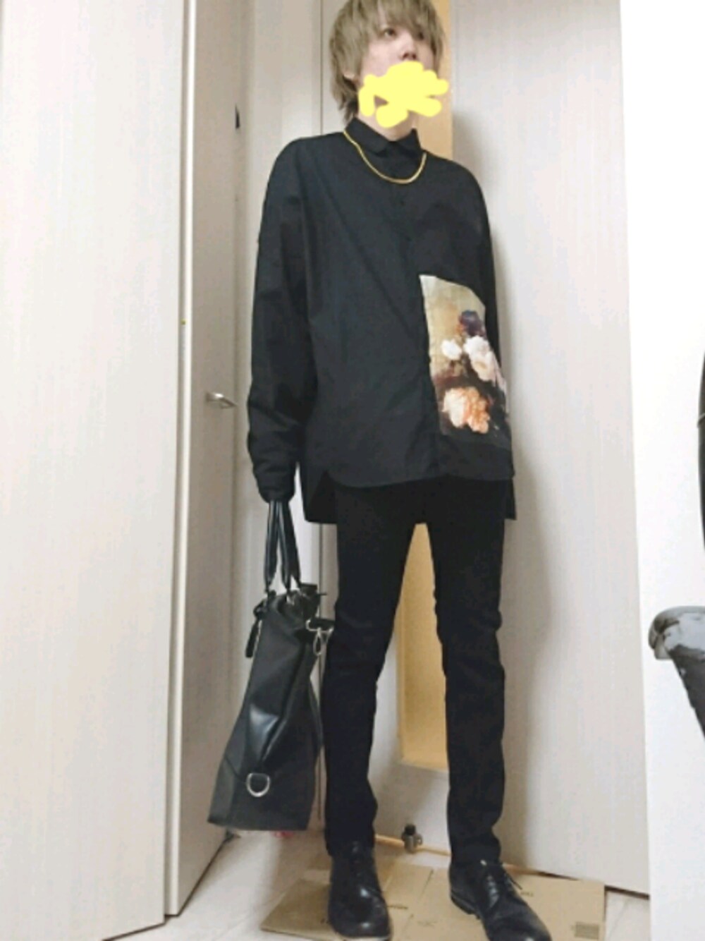 韓国で買ったシャツにオールブラックコーデ。 金のネックレスも忘れずに。