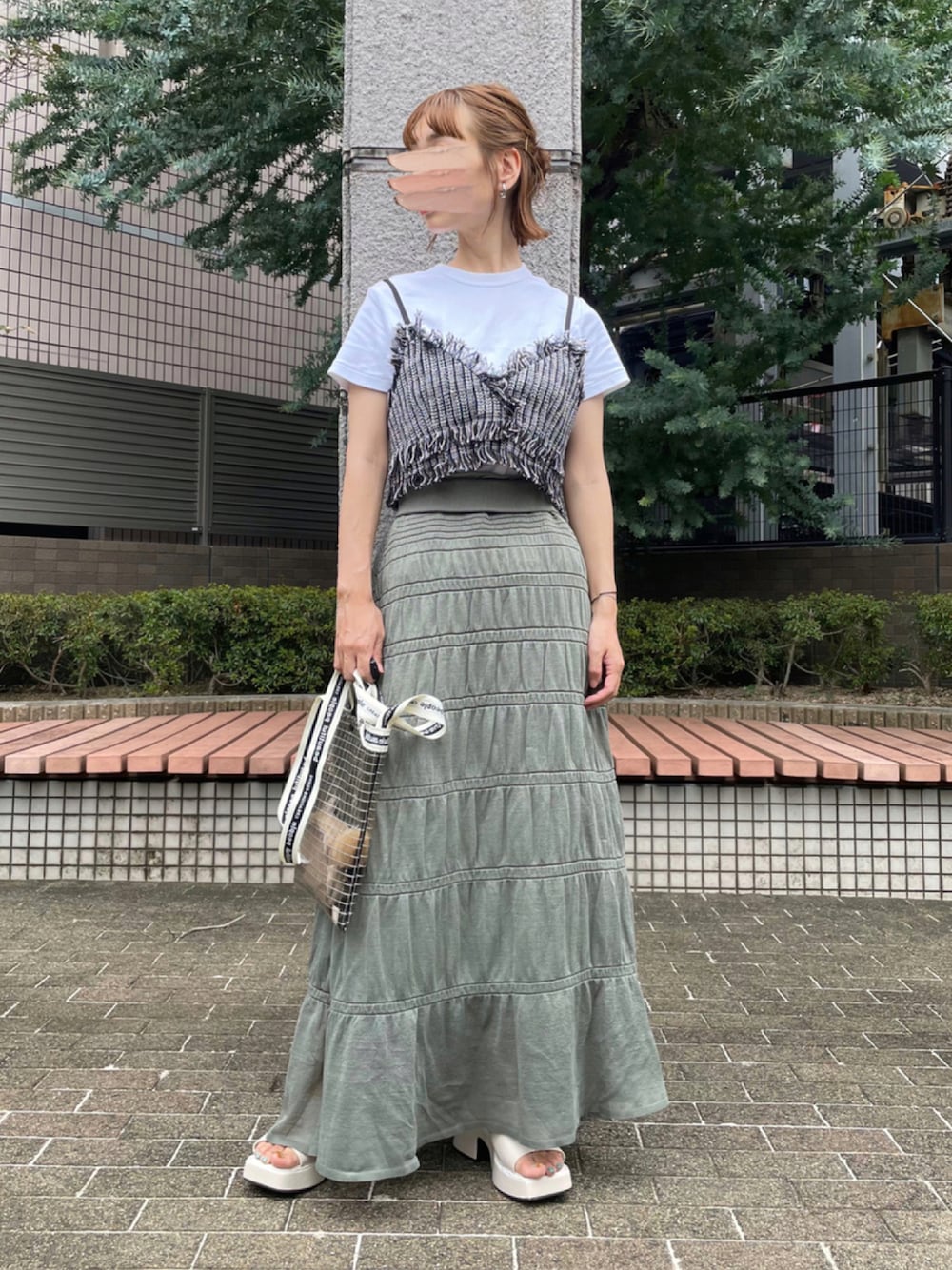 まちるだ のスカート「シャーリングティアードニットスカート」を使ったコーディネート