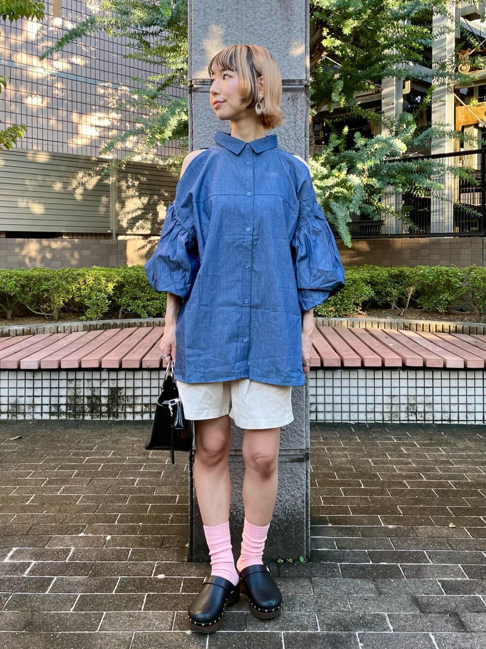 まちるだ のシャツ/ブラウス「デニム肩あきボリュームシャツ」を使ったコーディネート