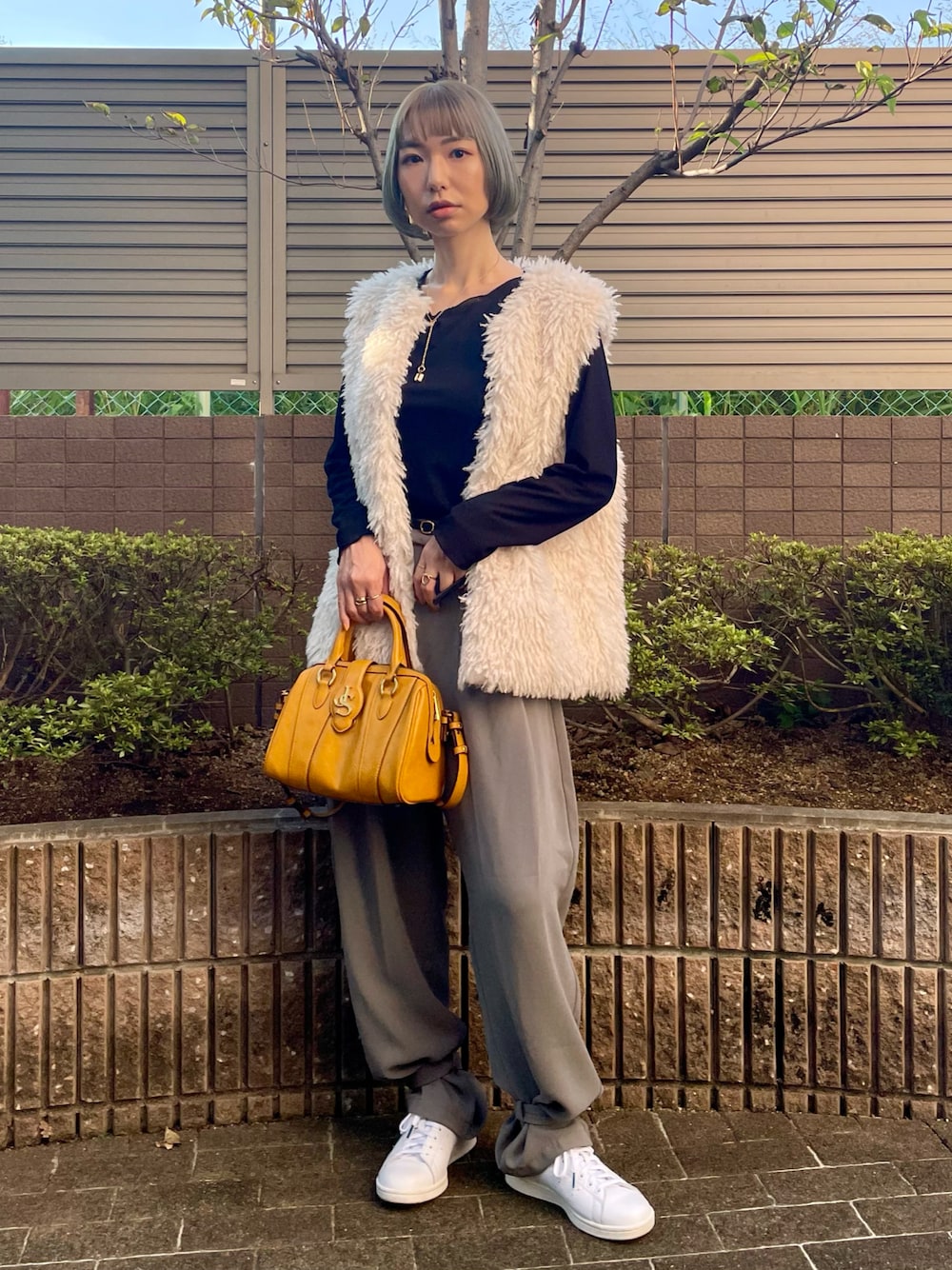 まちるだ のベスト「フェイクファーベスト」を使ったコーディネート
