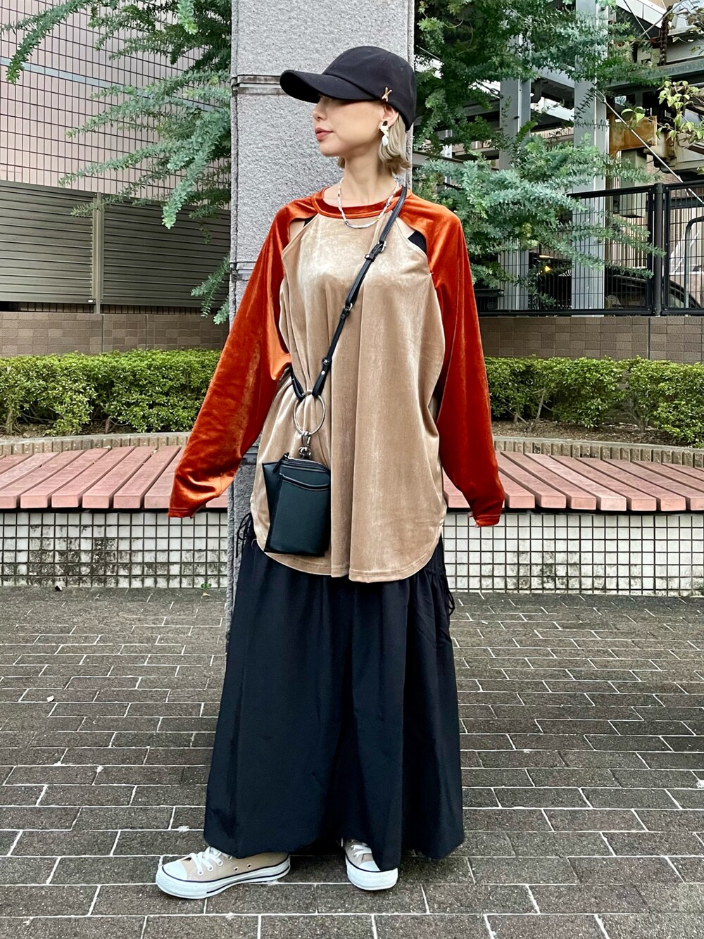 まちるだ のTシャツ/カットソー「ベロア配色肩スリットラグランTEE」を使ったコーディネート