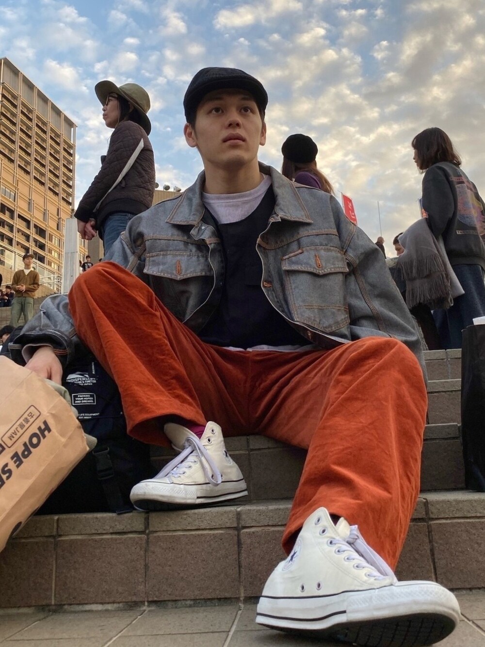 『光沢ジャケットのストリートコーデ』 皆さんこんにちは🌞 もう厚手のジャケットも羽織れる季節になりました。 冬になると、寒さ故にファッションの幅が狭まったりすることありますよね。 無難に合わせられる黒やカーキ、ネイビー、ベージュなどが多いと思います。 それでも目立ったオシャレがしたい!という方は 思い切って アウターを目立たせてみましょう‼️ 今回はシルバーのデニムジャケットという珍しいアイテムでコーディネートしてみました🥈 ⭐️ポイント⭐️ ●ステッチとパンツの色合わせ シルバーという合わせの難しい色を合わせる時は、そのワンポイントのカラーや、ステッチ部分で合わせるのが良きです! 今回はジャケットのステッチ部分がオレンジ🍊なので、パンツを同じ色で合わせました!! そーすると全体がまとまります! 皆さんも是非🙇♂️
