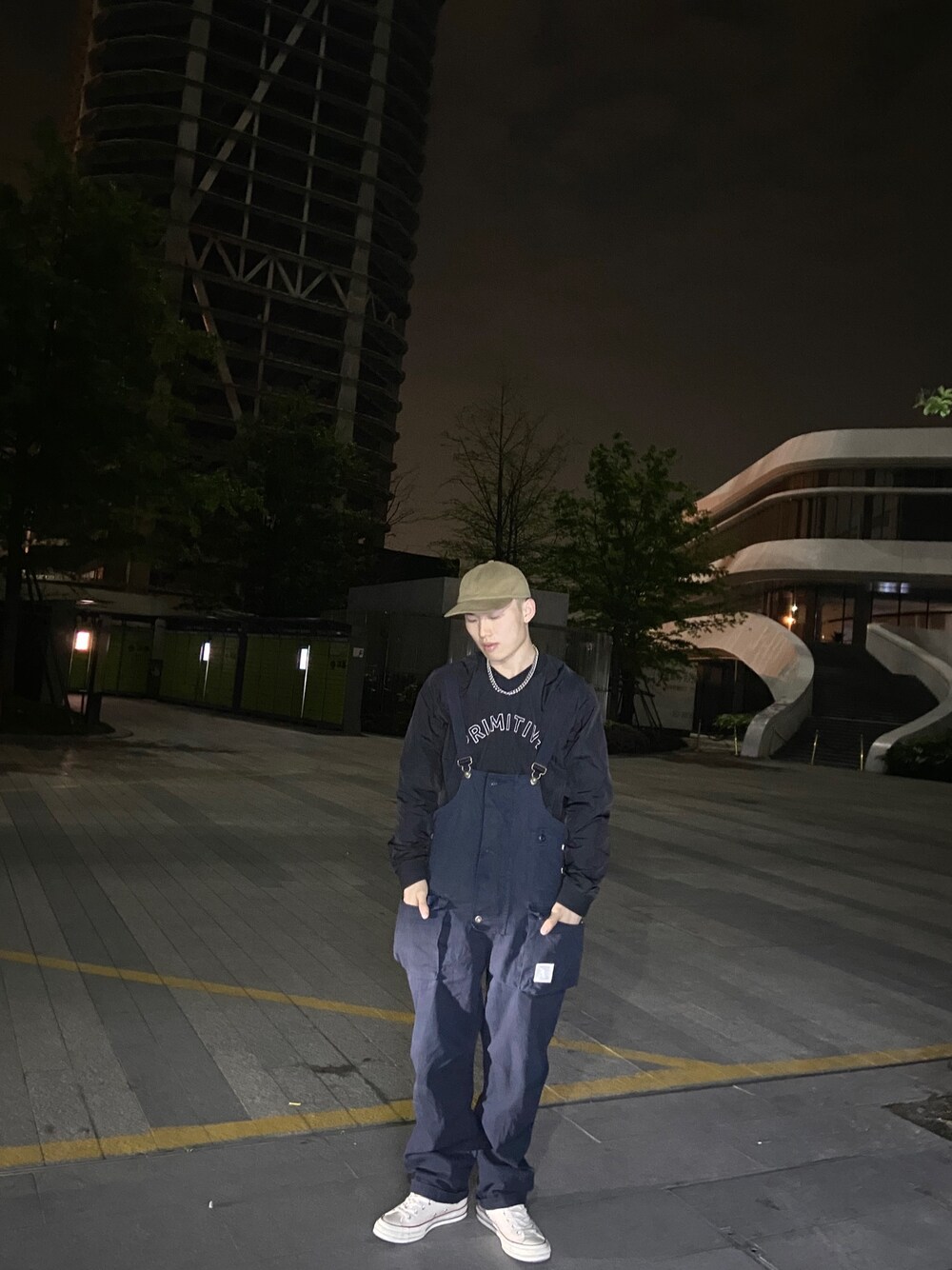 背带裤搭米色系的帽子和鞋 工装混搭感十足~