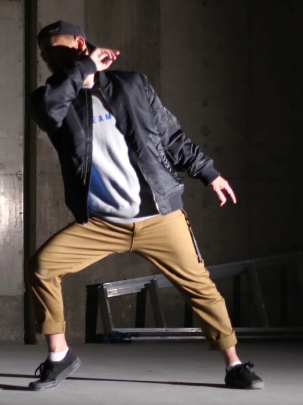PV撮影に着用した衣装。 パンツはレディースのMサイズ。 ストレッチがバッチバチに効いてるので愛用してます。 床が少し砂っぽい場所で踊ったので足と膝が少し汚れてます。 見えませんが、背中も汚れてます。 心は子供の頃のままです。汚れてません。