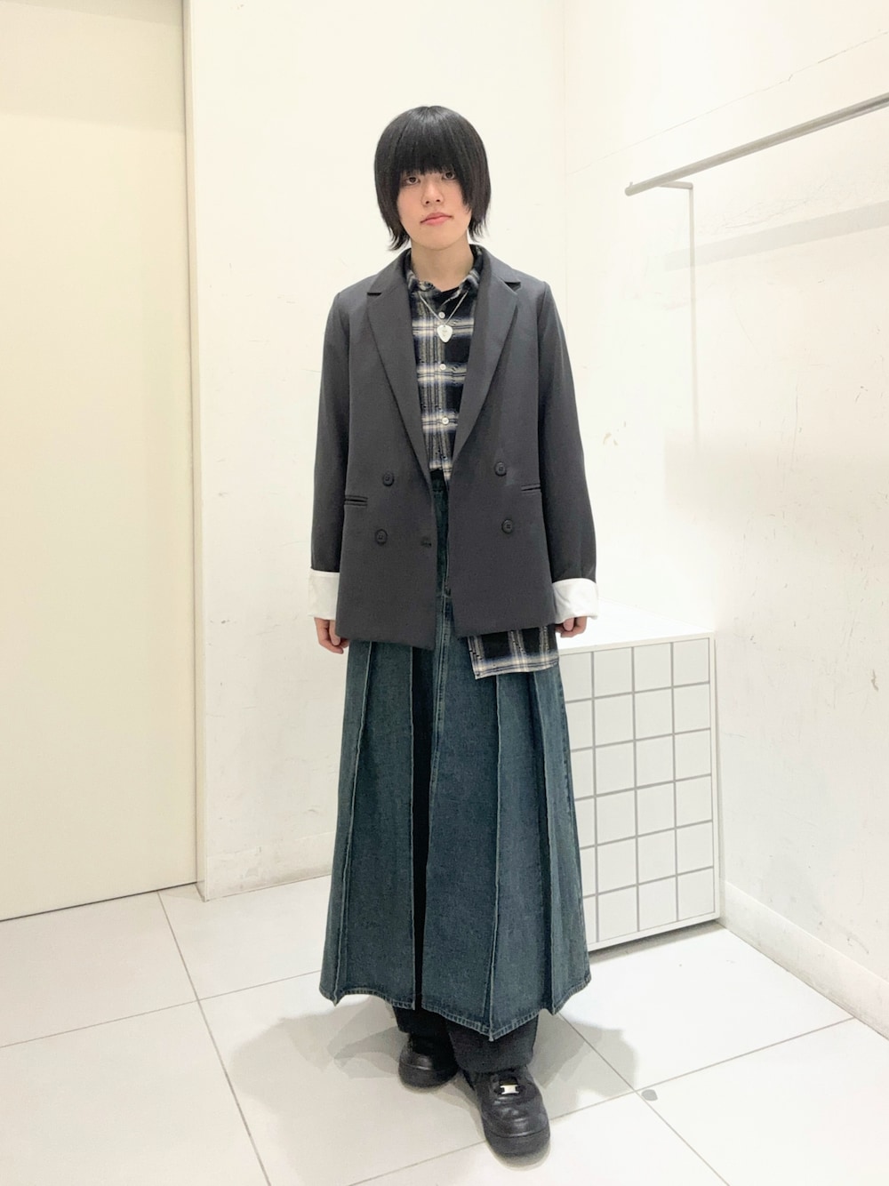 ご覧いただきありがとうございます! センスオブプレイスの新作のプリーツデニムスカートを使ったコーデです。 レディースの方が着てももちろん可愛ですし、メンズでもレイヤードスタイルなどで楽しめます。 あとパンツの上にスカート履くとあったかいです
