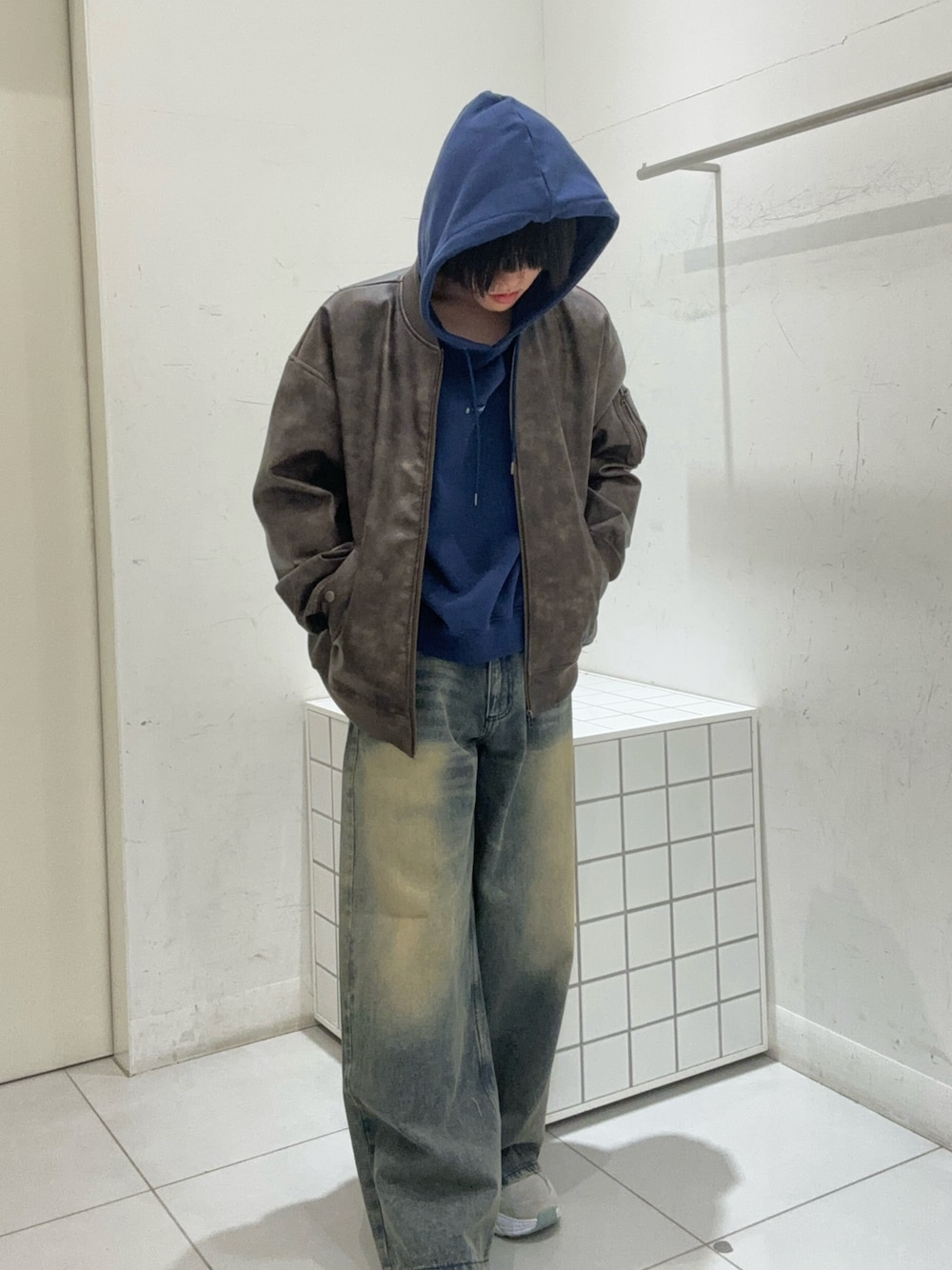 ご覧いただきありがとうございます! 胸元に煌びやかな石が装飾されたY2Kテイストのパーカーと、ヴィンテージ風味のフェイクレザーによるMA-1という、トレンド要素が詰め込まれたアウターでレイヤードしています。 ネイビーは青系の色ですが普通の青色と比べ、色味が落ち着いている分、茶色とも合わせやすいです。 夜の空や海の色もネイビーに近いため、アースカラー(自然の中にある色)として捉えて、コーデに絡めるのもアリです。 デニムパンツもブルーの生地に施された加工によって茶系の色が加わっているため、他のアイテムと上手くバランスを取ってくれています。