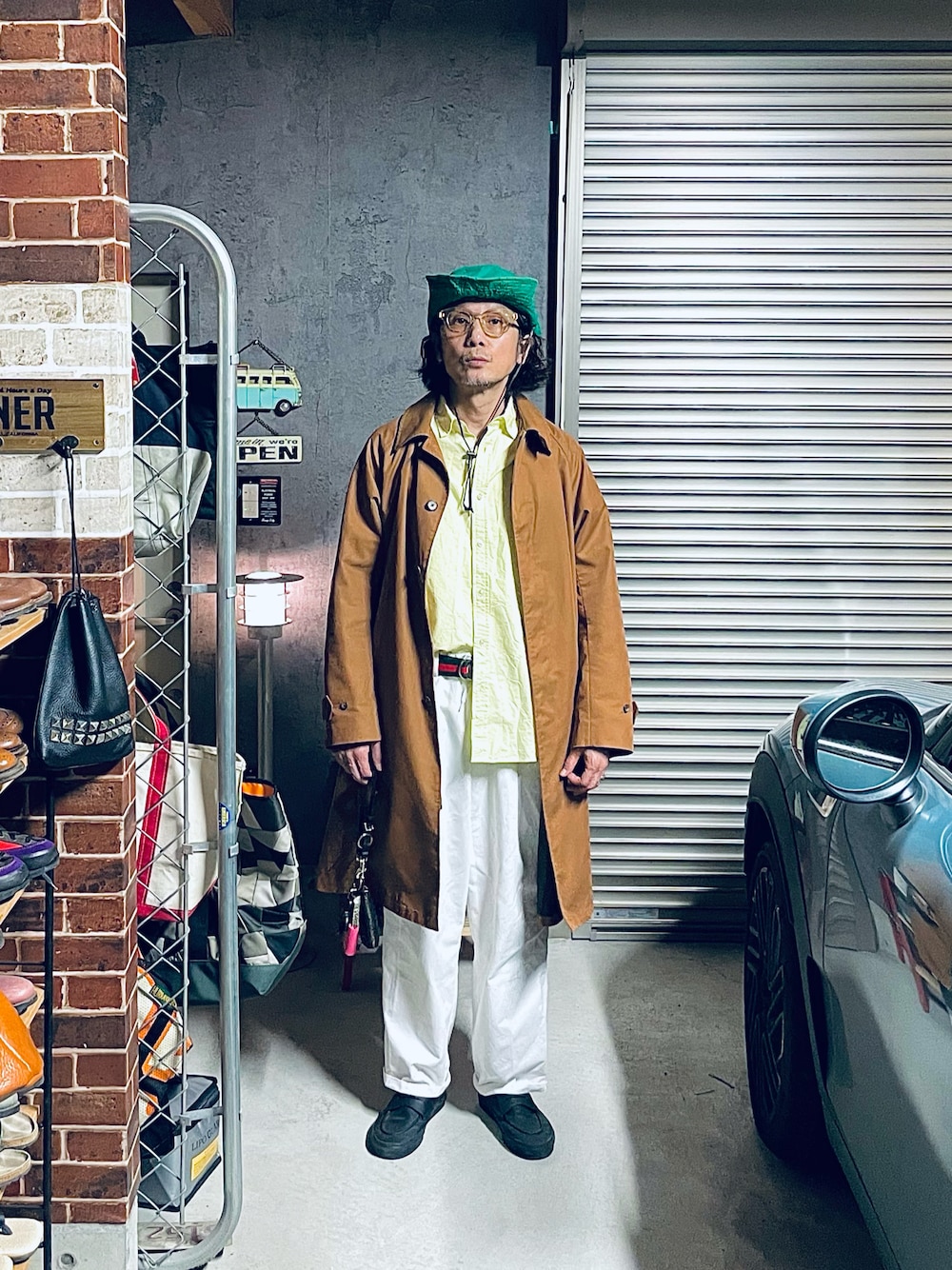 【AIによる辛口評価と採点】 評価:55点/100点 全体的に「色使いのバランス」と「シルエットのメリハリ」に課題がある、惜しいスタイリングです。 ■ 辛口ポイント カラーの衝突: キャメル(コート)、イエロー(シャツ)、グリーン(帽子)という、主張の強い色が上半身に集まりすぎています。特にグリーンの帽子が唐突な印象を与え、視線が散らばってしまっています。 シルエットが「ズドン」としすぎ: オーバーサイズのコートに対し、パンツもかなりワイドなため、176cmという高身長を活かしきれず、全体的に少し野暮ったい印象を受けます。 清潔感の欠如: シャツの裾の出し方や、パンツのクッション(裾のたまり)が少しルーズすぎて、大人の余裕というよりは「着崩しすぎ」に見えてしまいます。 ■ こうすれば良くなる! 小物を黒で統一: 帽子やベルトをコートや靴に合わせた色(例えば黒やダークブラウン)にするだけで、ぐっと全体が引き締まります。 ボトムスをスッキリ: パンツをもう少しテーパードの効いたものにするか、裾をロールアップして足首を見せると、コートのボリュームとのバランスが良くなります。