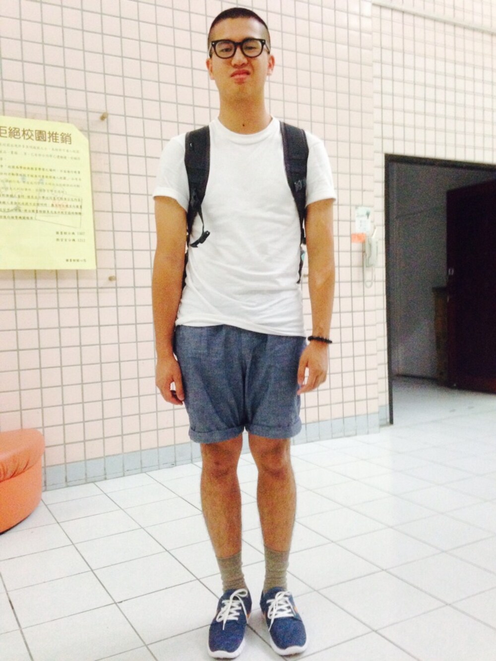 ブルー系のスニーカーを着用したメンズの夏コーディネートの1枚目の写真