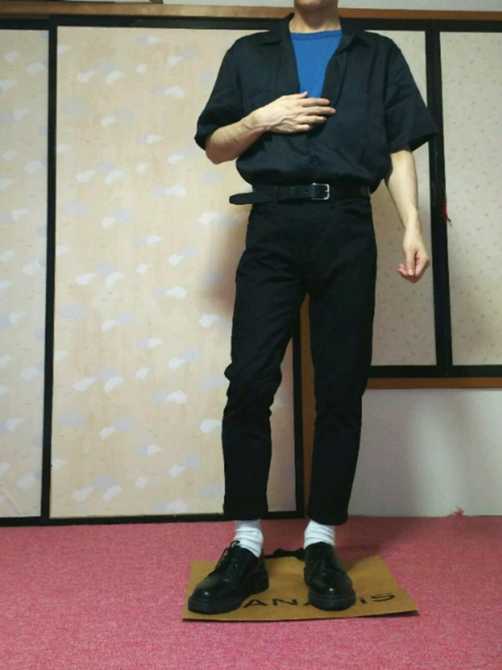 おはようございます( ´∀`) いつも【いいね、お気に入り】ありがとうございます! 今回は、黒のオープンカラーシャツに黒スキニー、青のTシャツを合わせました! よろしくお願いします(*´-`)