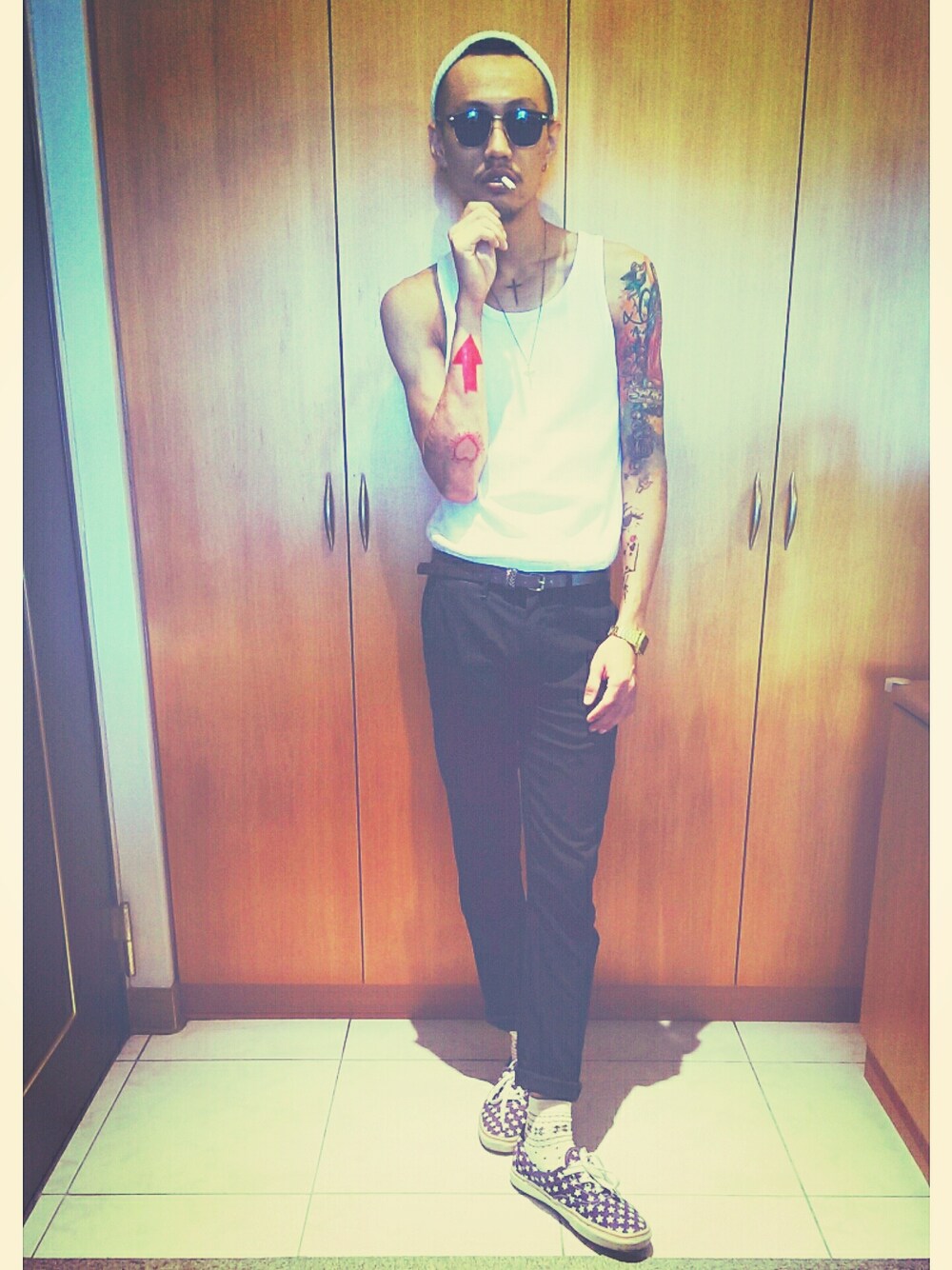 ブルー系のスニーカーを着用したメンズの夏コーディネートの1枚目の写真