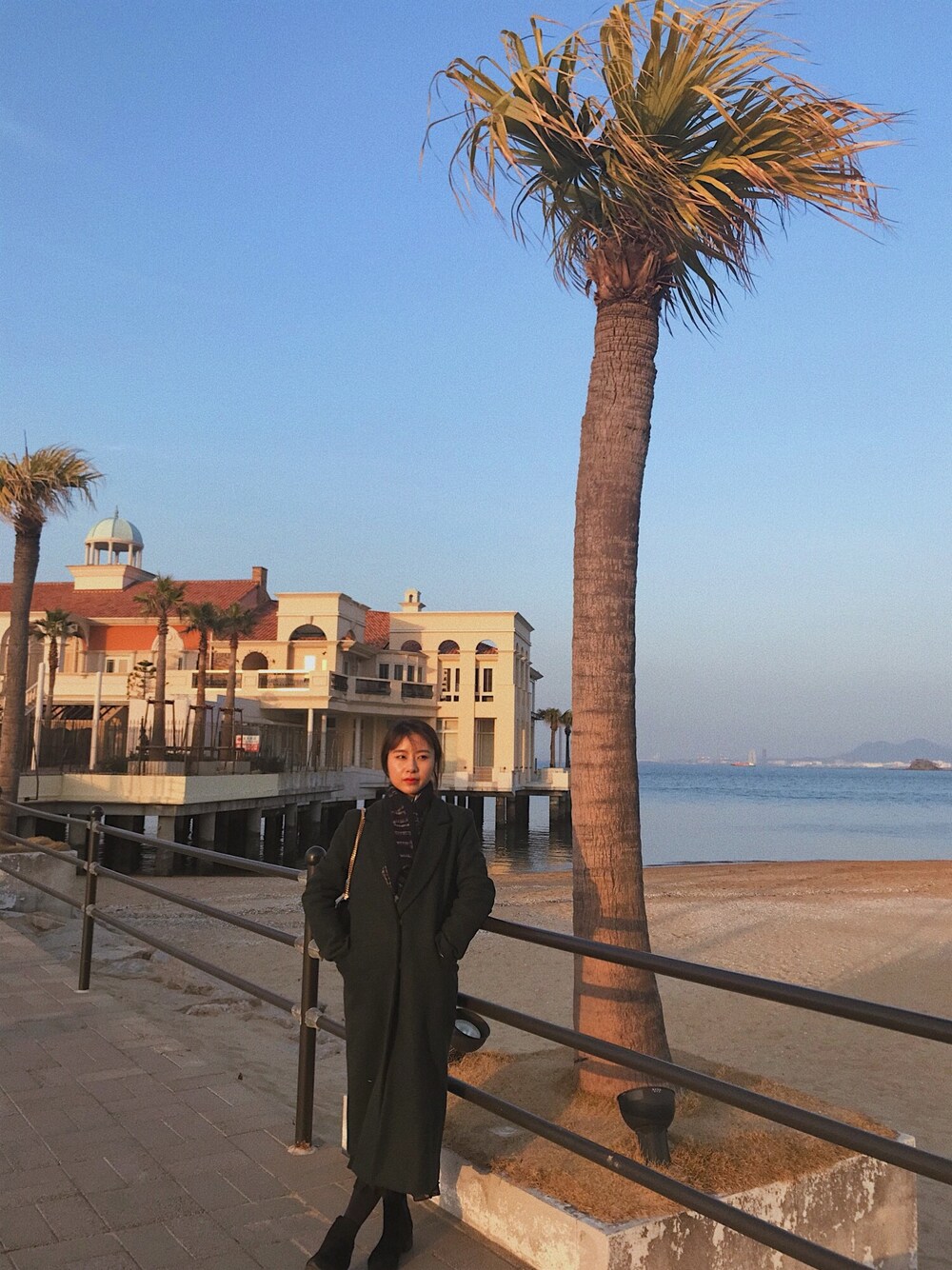 グリーン系のチェスターコートを着用したレディースの冬コーディネートの1枚目の写真
