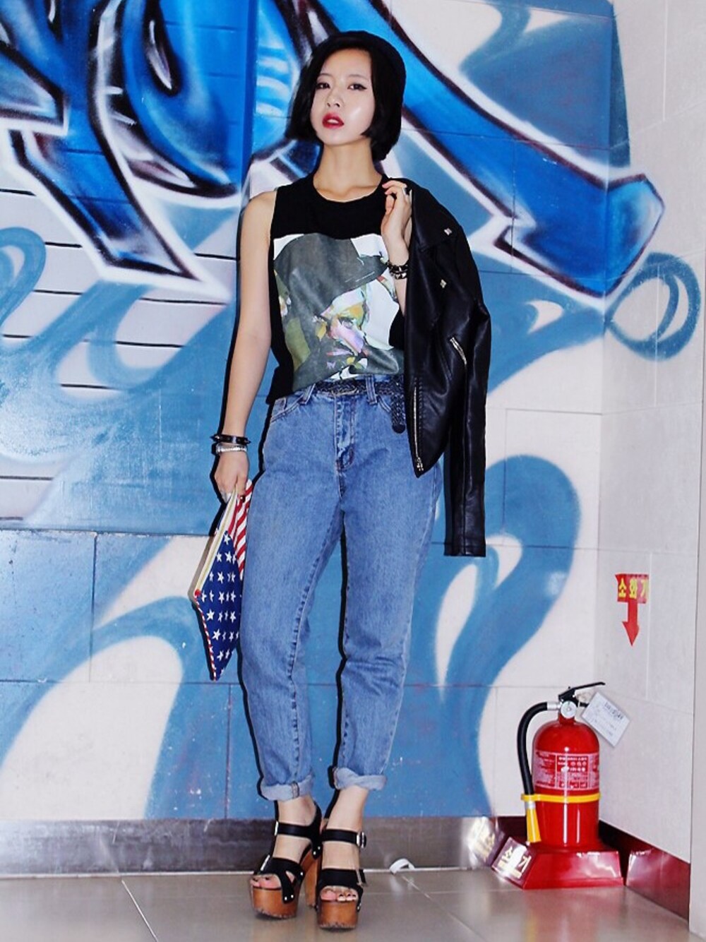 네이비비니 + 프린팅탑 + 라이더자켓 + 블루진 + 통굽힐 + 성조기클러치 인스타 @danmi4u 블로그 http://blog.naver.com/eudem_