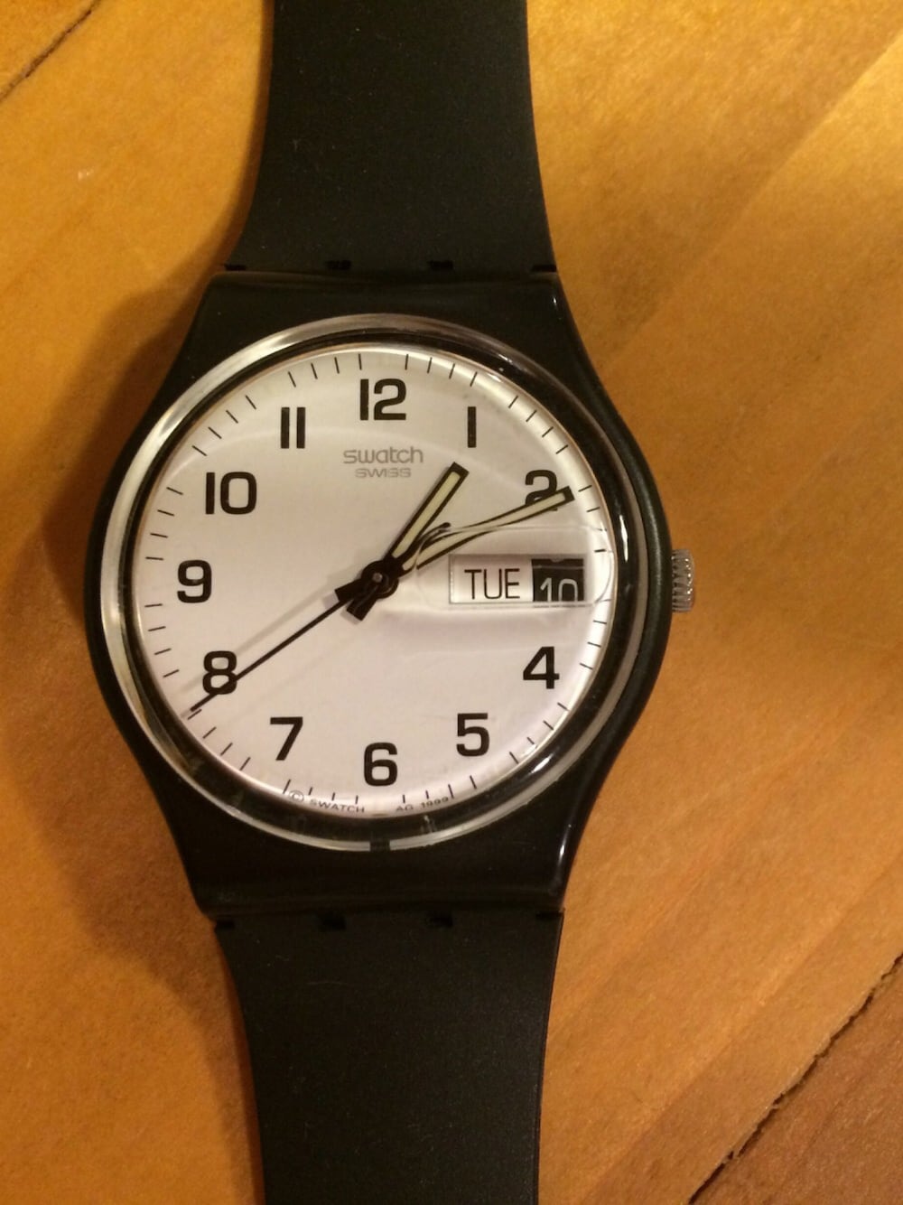 最近使っている時計がノンデイトなんですが、やっぱり仕事する上で不便なのでこちら。安心のSWATCH。