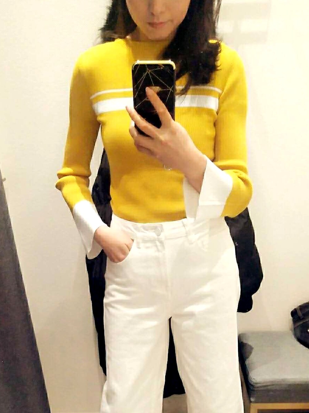 非常春天的颜色搭配 喇叭袖黄色与白色交织针织衫 搭配一条7分白色阔腿裤 太适合春假出游穿着了 早晚时外披风衣/牛仔衣/外套 再搭一双运动鞋出门就妥妥的