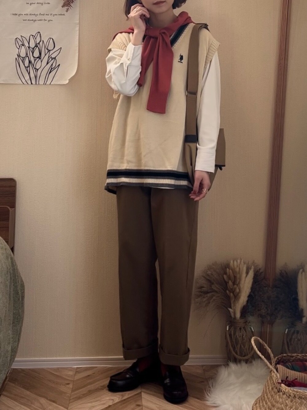 𝚍𝚊𝚛𝚊.のベスト「U.S. POLO ASSN. /ユーエスポロアッスン 別注 ワンポイント刺繍ロゴ ルーズチルデンニットベスト」を使ったコーディネート