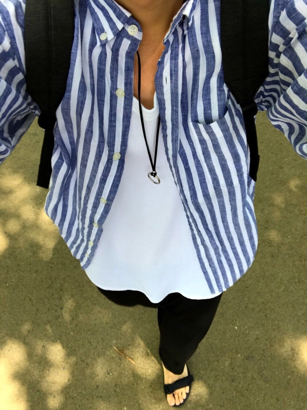 ストライプシャツの夏コーデをしてみました。 ネックレスでシンプルさにアクセントをプラスしたつもりです。 よろしければ、いいねやフォローお願いします(^^)