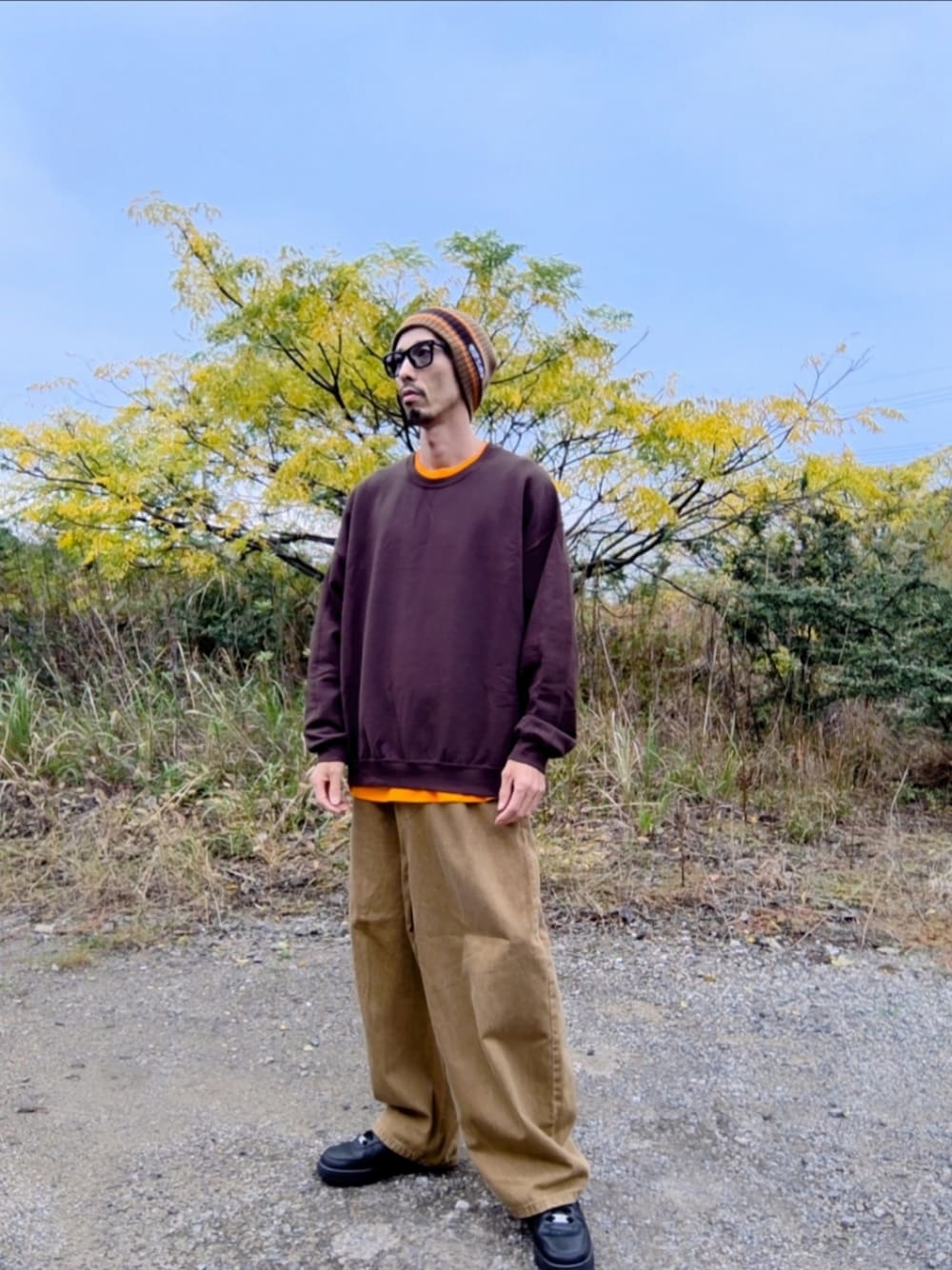 ブラウンコーデにオレンジ🍊を足して見ました。 天気も悪いし、プチプラコーデです😎