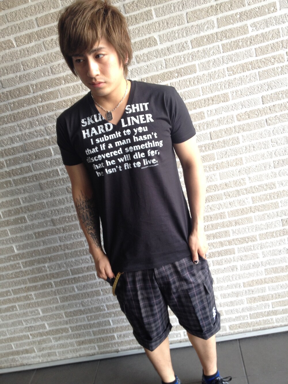 SKULLSHIT アイテムを使った夏コーデです。 新作のVネックTにロールアップした7分丈パンツ、レオパード柄のスニーカーを合わせたゆるく着つつも、ロックテイストを忘れないコーデにしてみました。