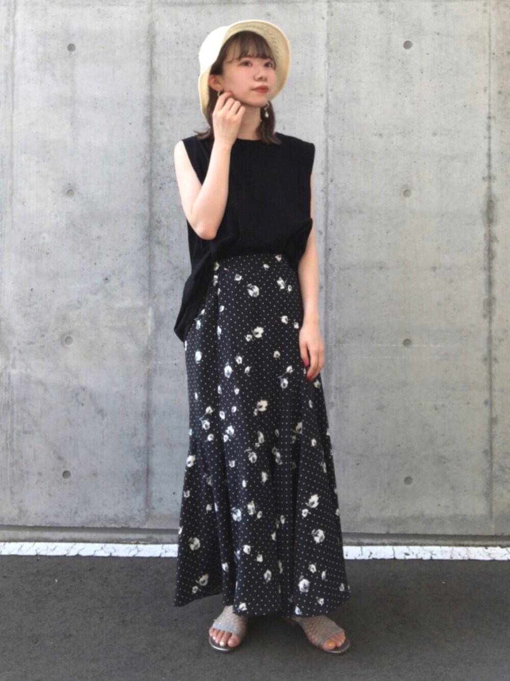 柄がめちゃくちゃお気に入りのスカート☺️❤️‍🔥ネイビーに白の花柄とドットで、配色が清楚過ぎず、レトロな雰囲気もあって古着とかに合わせても絶対かわいいスカート✌️形もマーメイドでかわいい。綺麗。