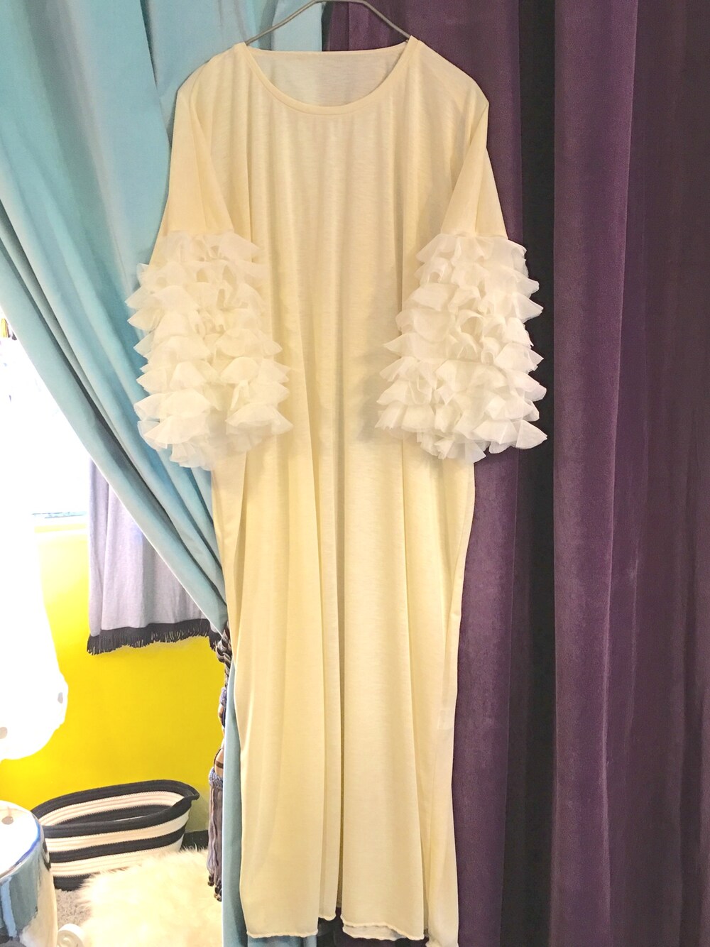 フランス製のチュールフリルが個性的なマキシワンピースにエクリュカラーが登場しました〜🐏