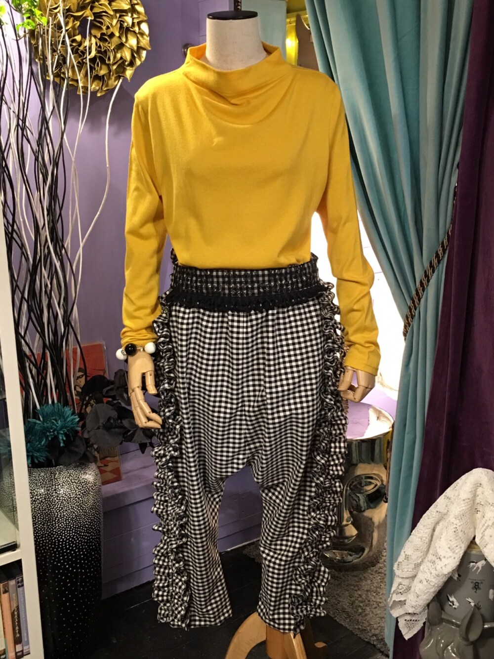 マスタードイエローのトップスにフリルが個性的なギンガムチェックのサルエルパンツはサッシュベルト付き! サッシュベルトはヘアバンドにしても可愛いですよ♡