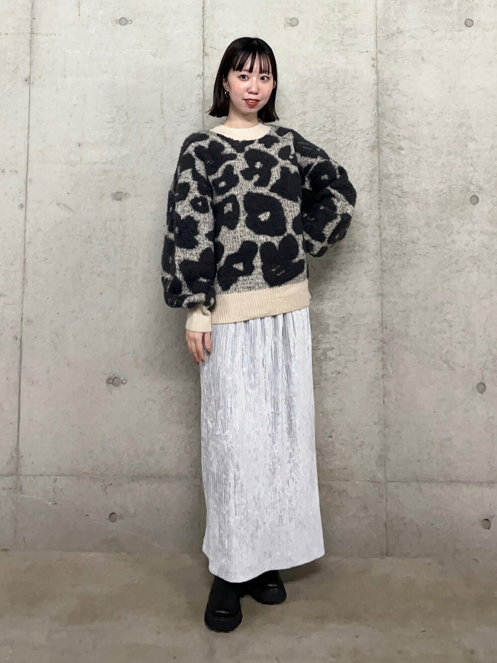 フラワー柄のニットは少し長めな丈感がポイント♪ ブラックとシルバーでまとめてクールな印象に◎ スカートはフリーサイズ着用でしたが丈感ぴったりです~~!