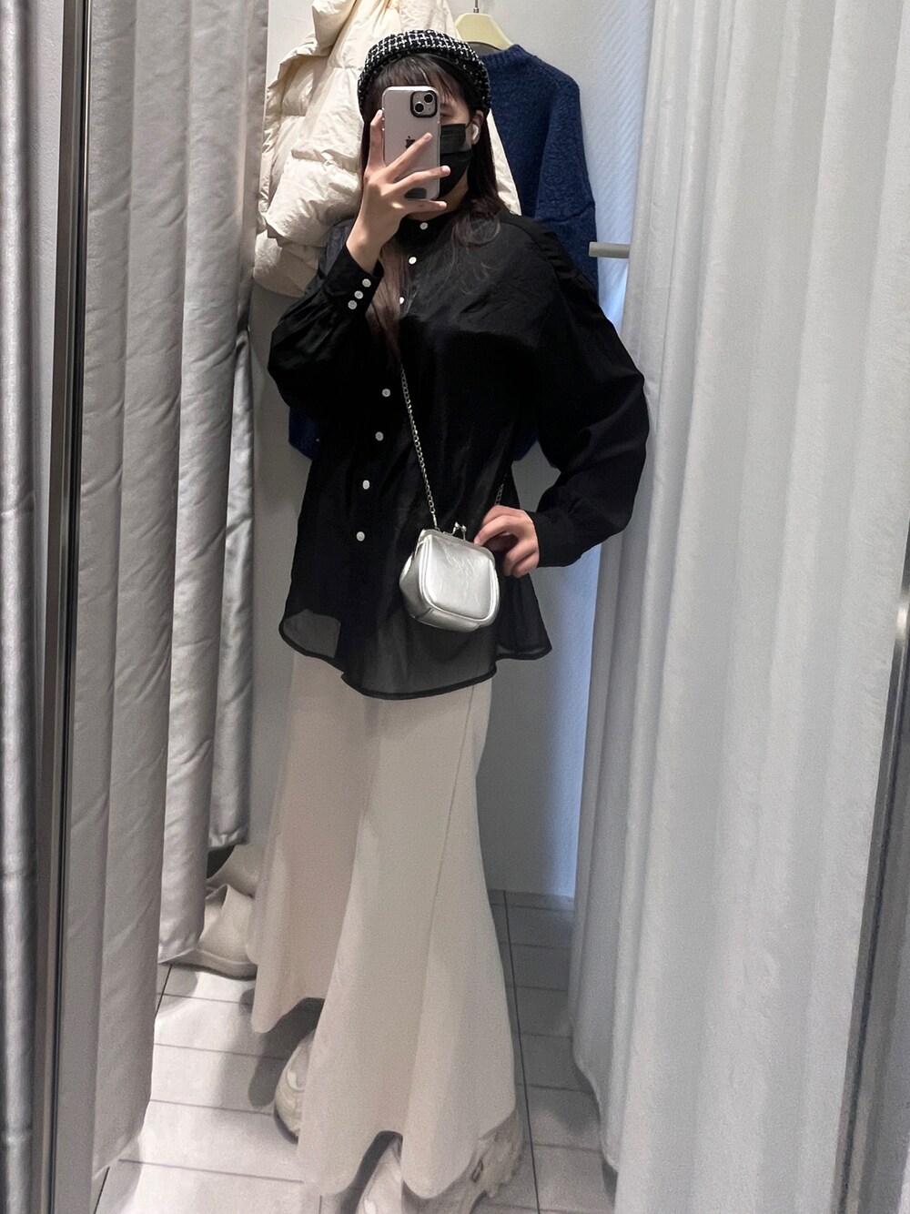 ブラック系のシャツ/ブラウスを着用したレディースの冬コーディネートの2枚目の写真