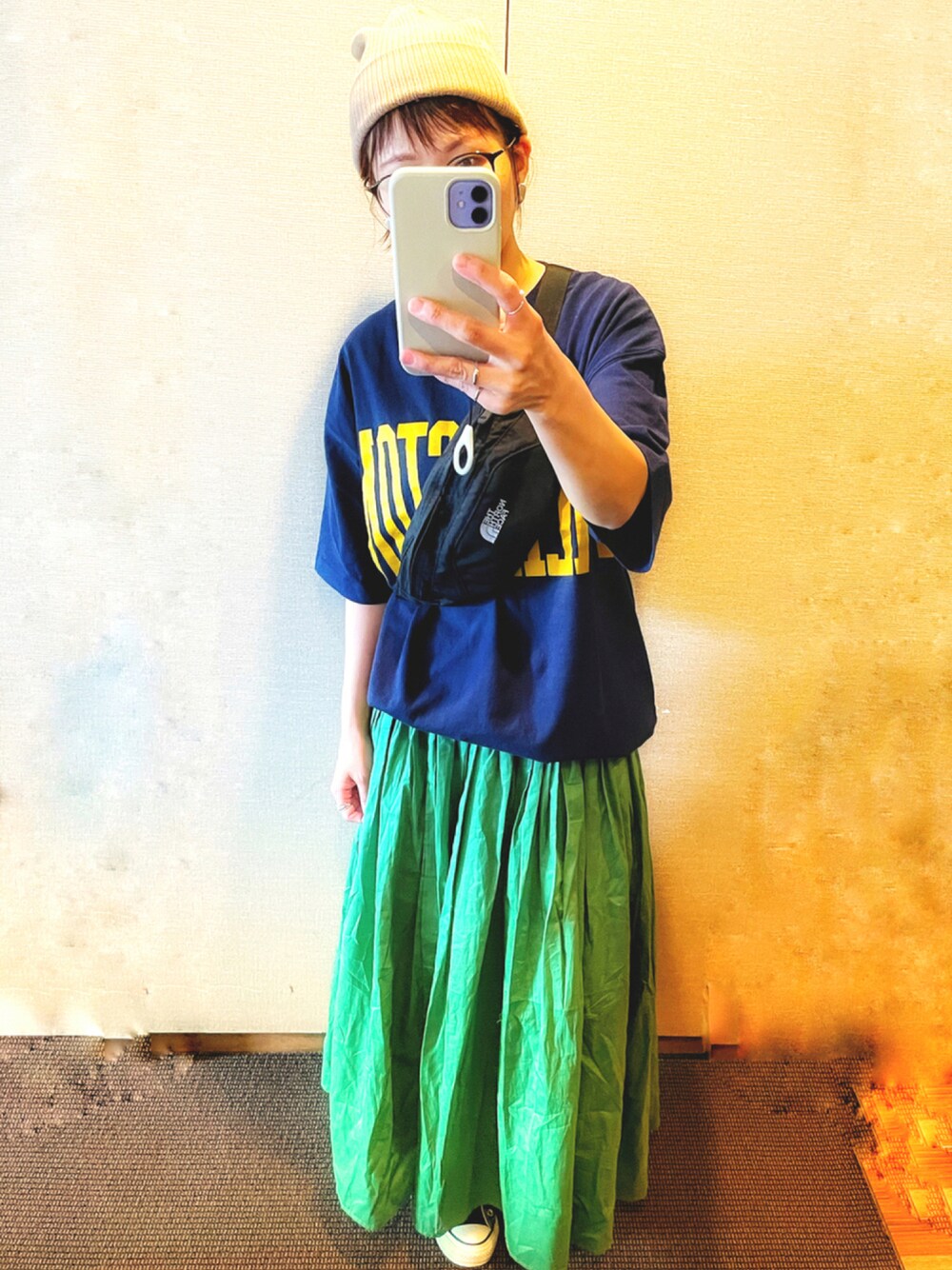 見ていただきありがとうございます⭐︎ FREAK'S STOREのカレッジTシャツ⭐︎ 黄色のロゴが可愛いです⭐︎ グリーンの色の物を見ると買ってしまう🎶