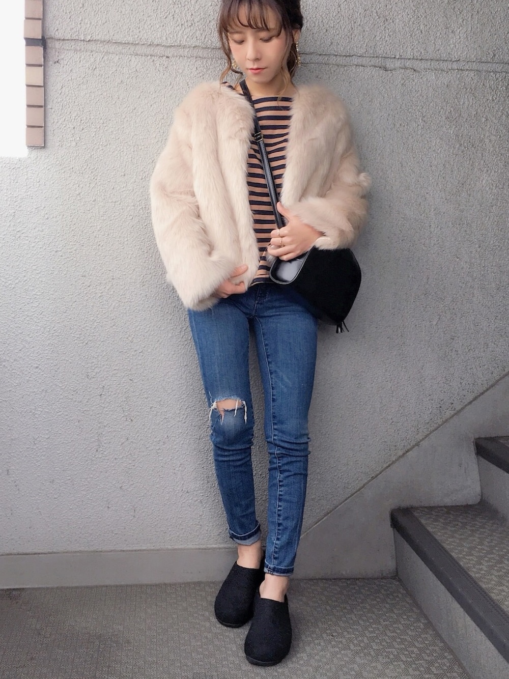 Instagram...dayofme0607(yumi.) code...久しぶりにsenceofplaceさんの ファーコート。 無地よりボーダー合わせが好み☺️ 見ていただきありがとうございました! いいねお気に入りフォローありがとうございます!