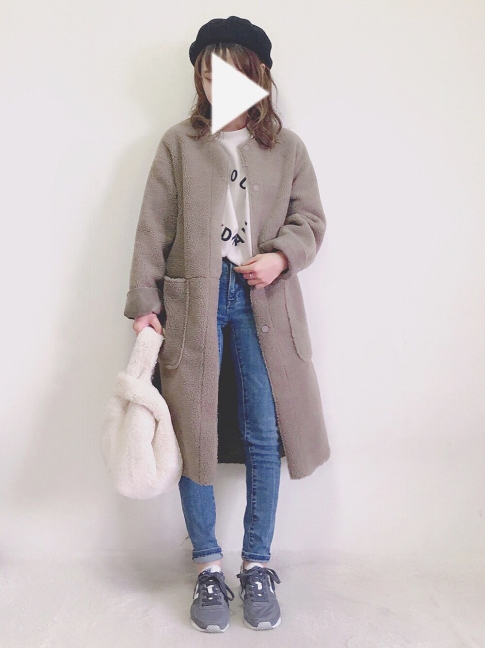 yumi.のムートンコート「リバーシブルフェイクムートンノーカラーコート」を使ったコーディネート