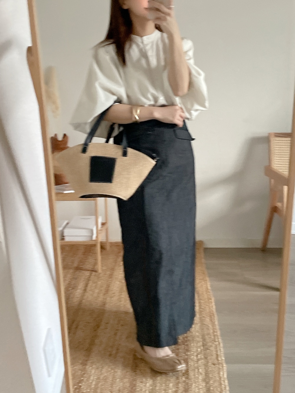 yumi.のシャツ/ブラウス「【yumi.コラボ】ふんわり着映え。ボリューム袖バンドカラーブラウス」を使ったコーディネート
