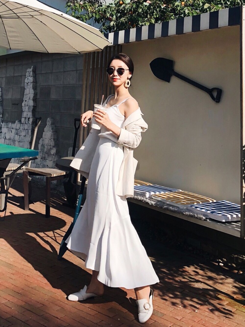 ホワイト系のテーラードジャケットを着用したレディースの夏コーディネートの1枚目の写真