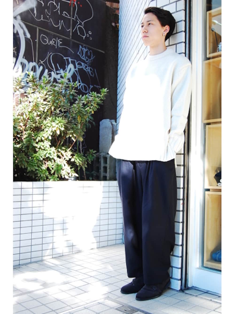 WHITEのニットをメインにシンプルなコーディネートです。 暗いトーンを選びがちな冬の季節に明るめのニットもオススメです! コートのインナーに着用しても爽やかな印象があります◎