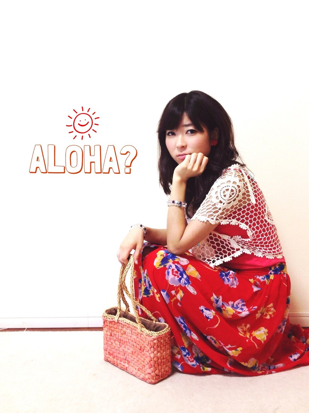 ゆるり。リゾート風 ★オーストラリアのお土産でもらった、 レース編みのキャミと forever21のリゾートスカートがマッチ(^ ^) バッグもカゴにして、完全に常夏スタイル♪ 赤×白はかわいい(^ ^) 人気のミニーやキティも、赤白だもんね