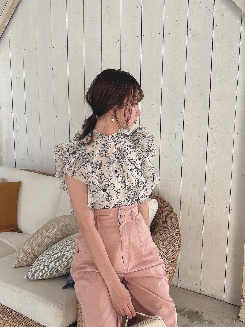 ▪︎トップス 袖のフリルがかわいいブラウス♡ 花柄ですが線画タッチなので甘くなりすぎずに着ていただけます! 少し張りのある生地なので袖のデザインも立体感があり高見え🙆♀️ 同柄のスカートもあるのでセットアップ風はもちろん、シンプルなボトム合わせもおすすめです🙆♀️