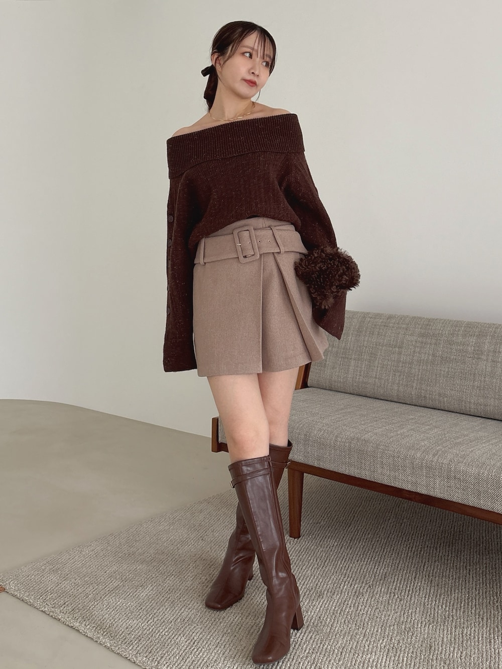 久間田琳加さんコラボコーデ♡ オフショルニットは程よいホールド感なので落ちてしまう心配なく着用できます。 袖のボタンは外してスリット風にするのも可愛いです! スカートのベルトは取り外し可能なので色んなコーデに合わせやすいです。 肉厚な素材なので真冬でも暖かく着用できます!
