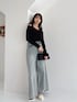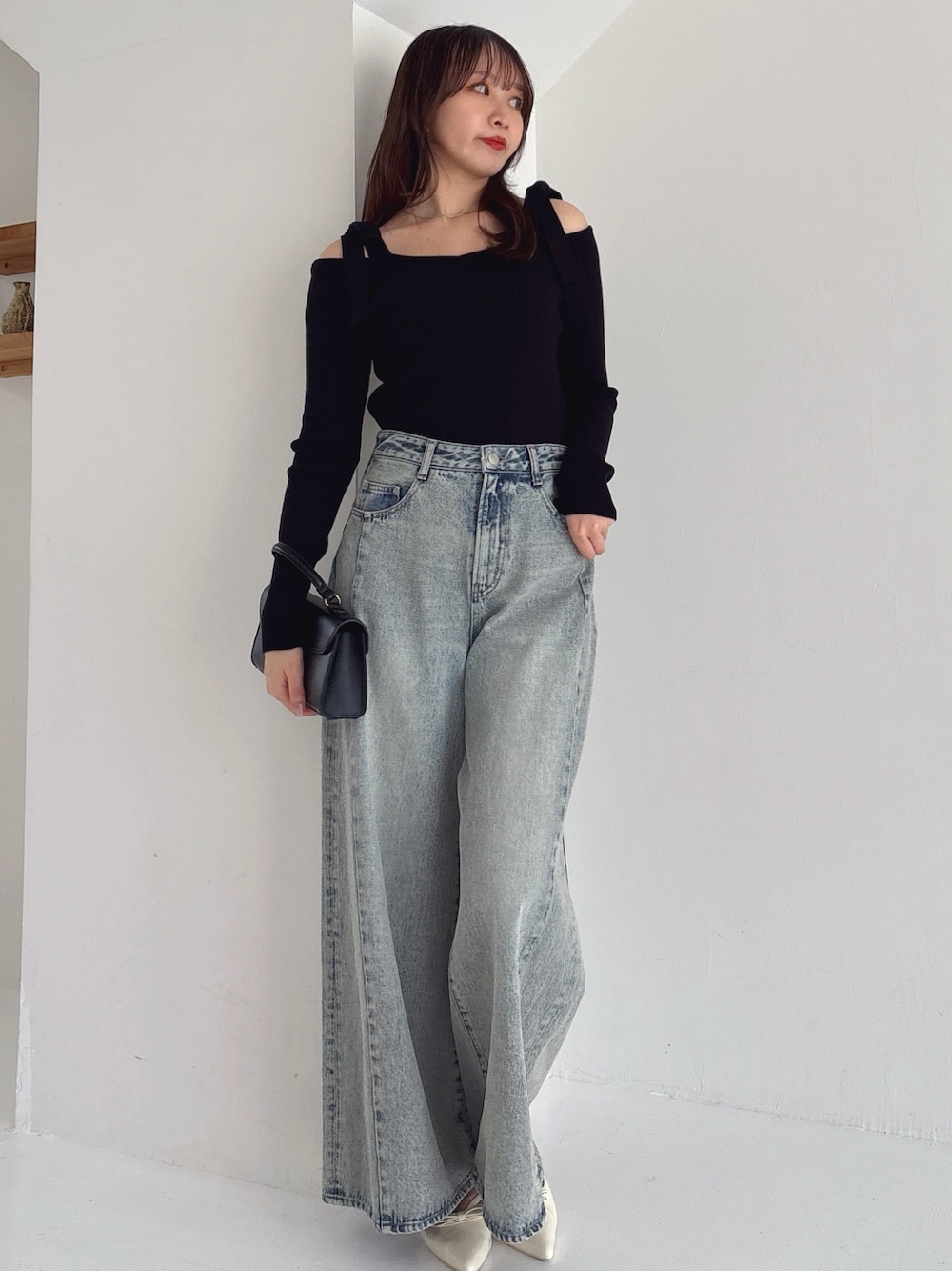 シンプルカジュアルコーデ♡ WEB限定のニットトップスは、生地が柔らかく肌触りがいいです!肩のリボンで長さ調整ができるのでサイジングがしやすいのもポイント。 デニムは少しだけハイウエストの位置で履くので足長効果🙆♀️!