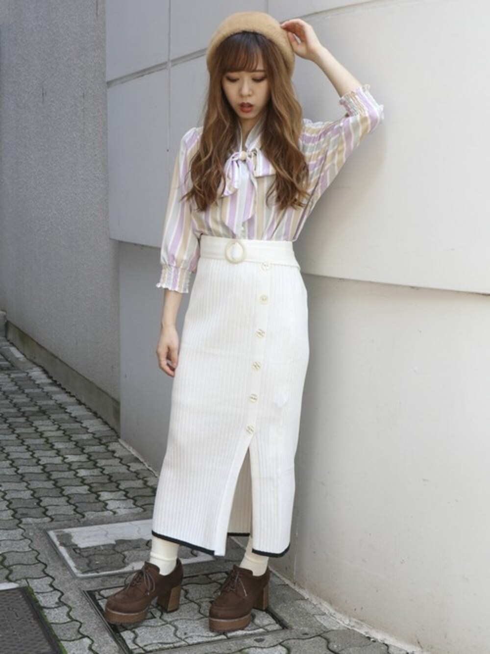 本日発売のニットスカート! シルエットがキレイ! スリットも入っていてちらっと足が見えるのがポイントです♪ ボウタイブラウスもZOZOで予約受付け中!