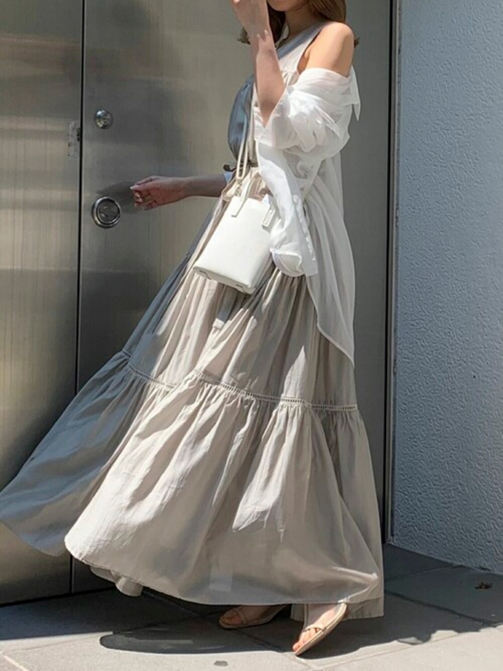 たっぷりな生地感と落ち着いた光沢感が大人っぽい印象のワンピース♡ シアーシャツを羽織って冷房対策もばっちり!! 夏~秋にかけてきていただけるアイテムです!