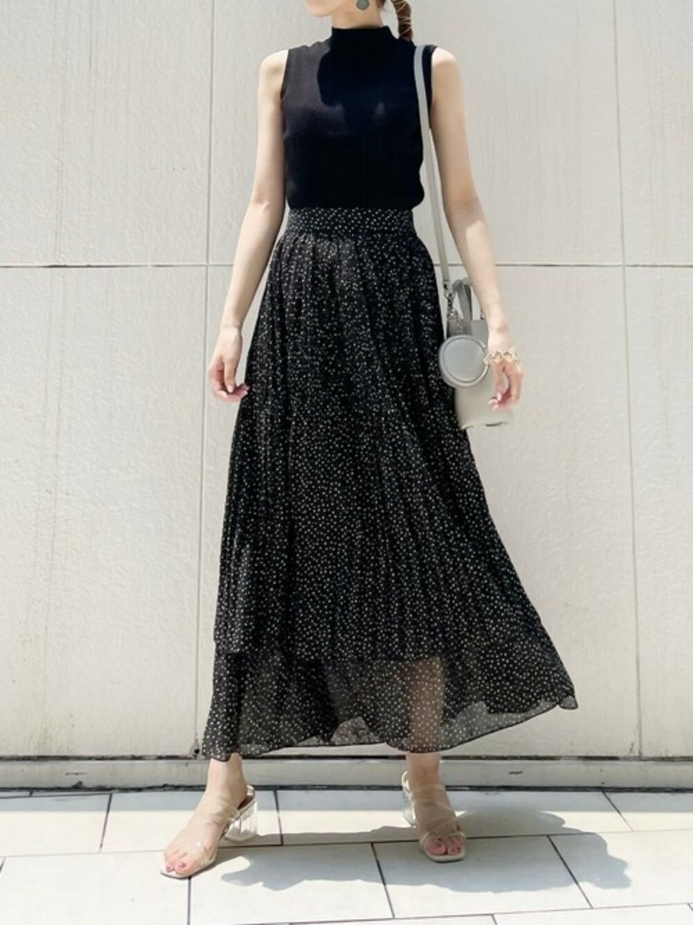 大人ドットコーデ♡ 甘い印象になりがちなドットもブラックで大人な印象に! 足元をクリアサンダルに変えることで、抜け感も出ます!