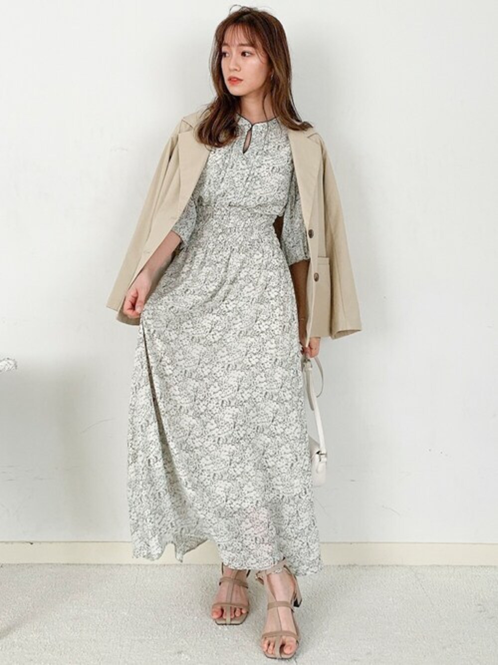 人気のワンピースの新色が登場♪♪ 落ち着いたグリーンの花柄が大人な雰囲気に! 今年はジャケットを羽織っていただくとトレンド感も出てかわいいです! 足元はサンダルはもちろん、スニーカーやローファーでもかわいいです。
