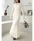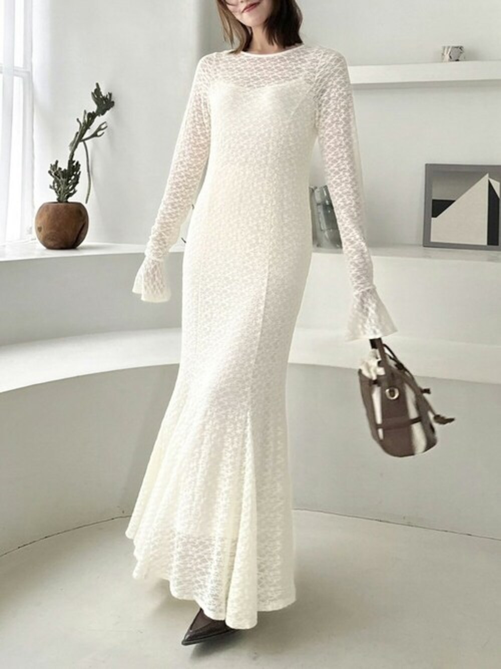 繊細なシュリンクレースで大人きれいめワンピース。 バックスタイルはボリューム感のあるシアーリボンがポイントに。