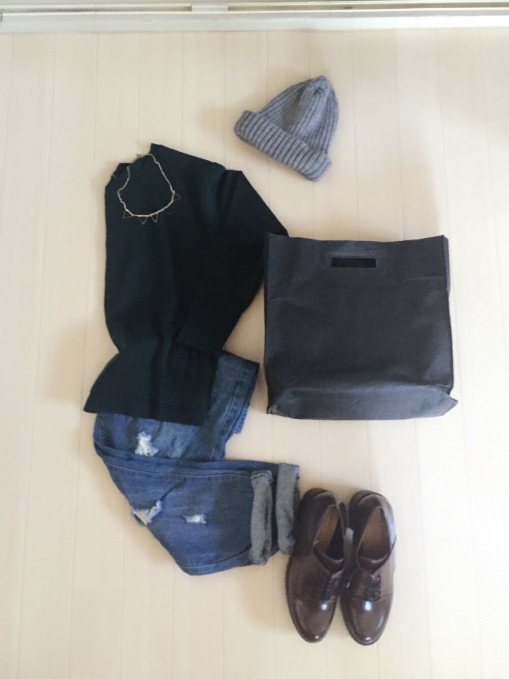 ダークグリーンのニットはお気に入り V字か丸首か迷ったけど BLISSの丸首は詰まりすぎてなくて 鎖骨もきれいに、みせてくれる サイドにスリットが入ってるのもポイント 無印のはバッグじゃなくて実は ファイルホルダー用 マチもあってお弁当もはいっちゃう シンプルだけど すこしクセを加えたいときに。