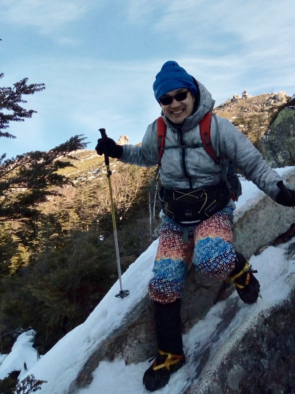 ジャケット:The Nothface Cubic Tech Trango Parka パンツ:Columbia Kipling Pant GypsyPrint ウエストバッグ:TERRA NOVA Laser 6 ビーニー:OUTDOOR RESEARCH トランスデントビーニー スパッツ:Monbell GORE-TEX ライトスパッツ ロング