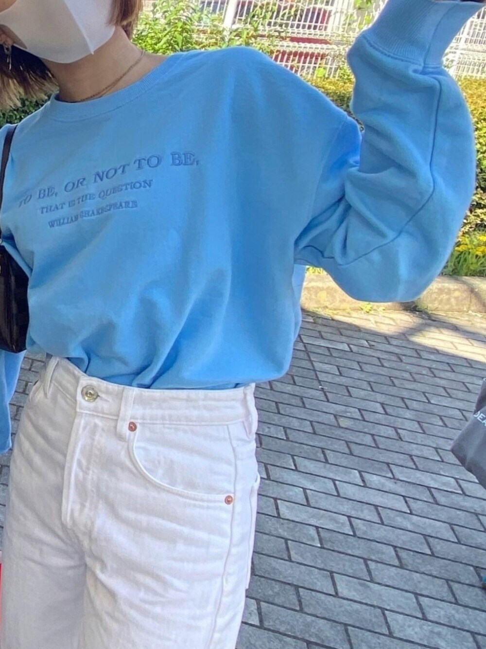ブルー系のパーカー、ホワイト系のデニムパンツを着用したレディースの秋コーディネートの1枚目の写真