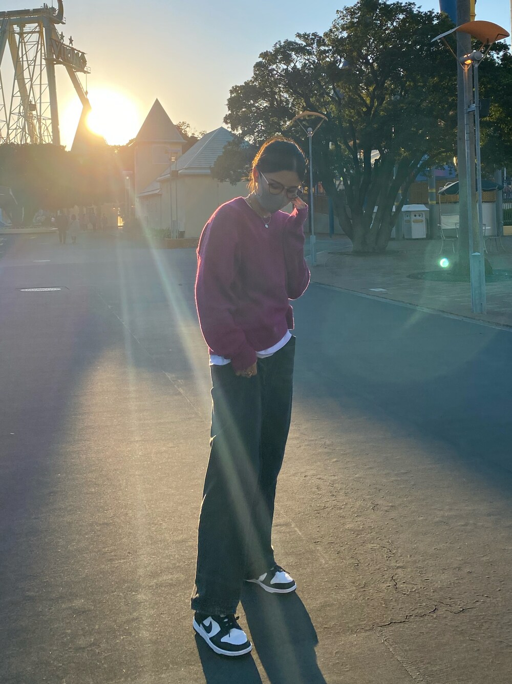 ブラック系のスニーカー、パープル系のニット/セーターを着用したレディースの秋コーディネートの1枚目の写真
