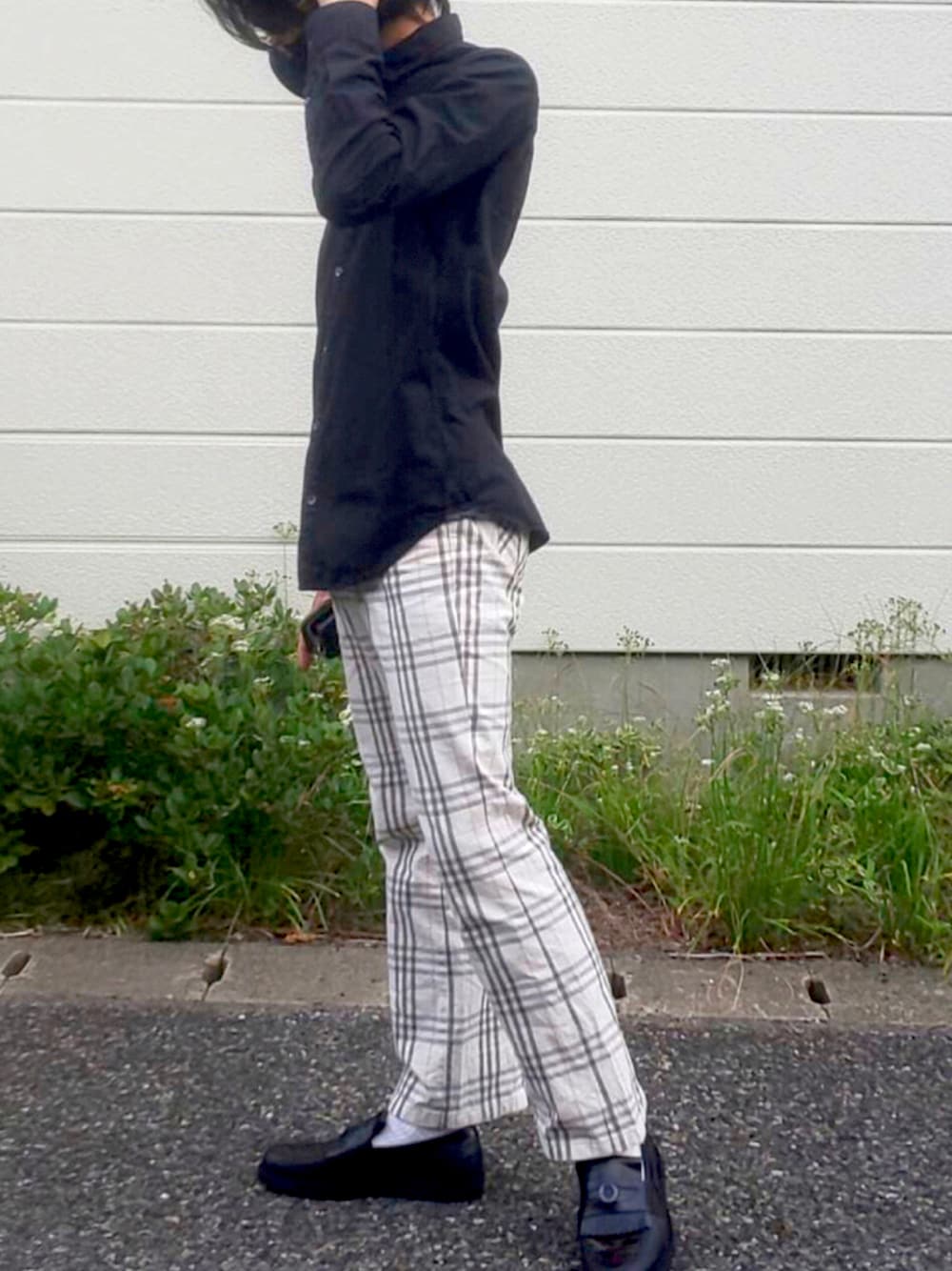 派手めのチェックパンツなので靴下では遊ばず、シャツとローファーで上品に落とし込んでいます。 このローファー、最近買ったのですがとても気に入ってます。