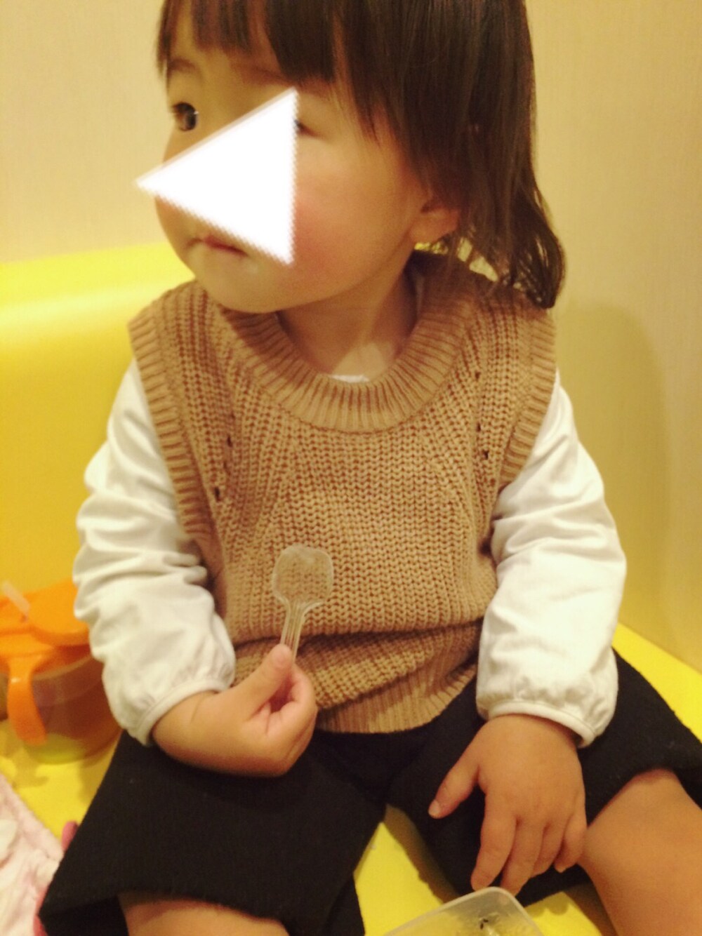 寝起きのお昼ごはんなのでおとなしくて素直でかわいい一瞬♡ 普段はとても激しい怪獣‼︎ ワイドパンツは裾上げしてる^^; 来年もまだまだ履けそうだな(˶‾᷄ ⁻̫ ‾᷅˵)
