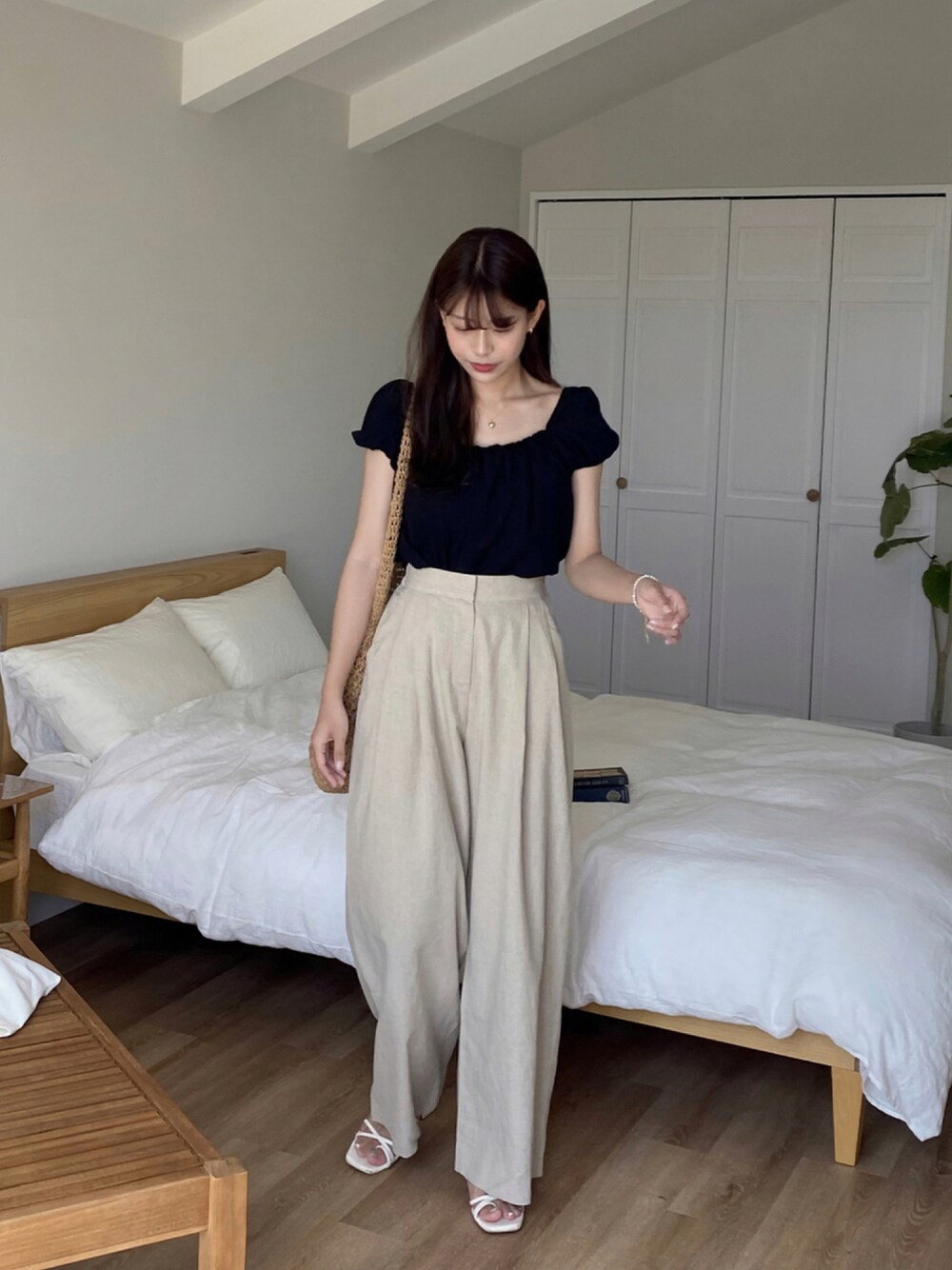 夏に黒のitemを着用しても暑い印象にならないよう、リネン素材の涼しいパンツとコーデしました。 top : 🏷 odds blouse / black pants : 🏷 linen slacks / beige bag : 🏷 runa bucket bag / brown shoes :🏷 thumb strap sandal / ivory Instagram @ddafm.en mood for a day @ moodforaday_official